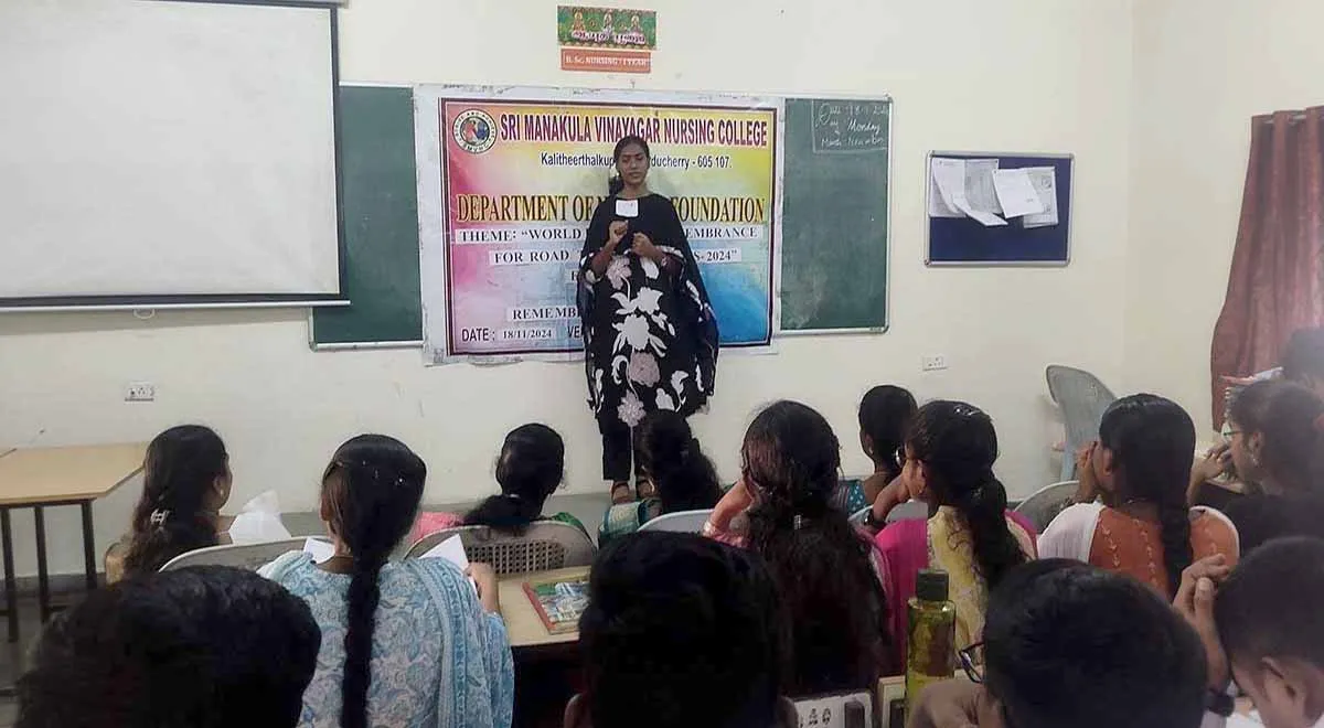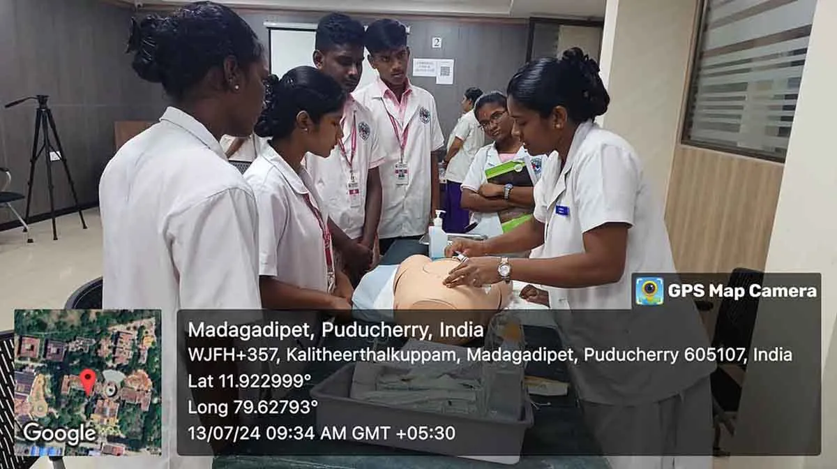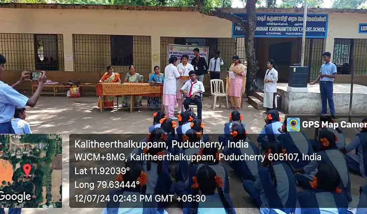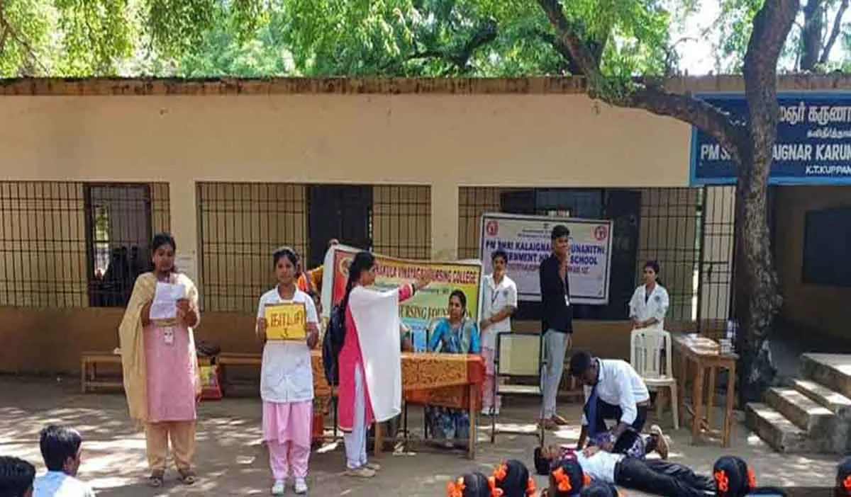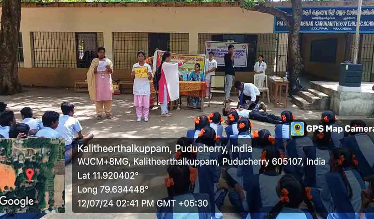 A School Health Programme was conducted on “First Aid Management (Road Traffic Accident)” on 12th July 2024. B.Sc. Nursing I-Year (II Semester) students performed a Role play at Kalaignar Karunanidhi Government Higher Secondary School, Madagadipet. The session benefited 103 students, 30 teachers, and 25 staff members.