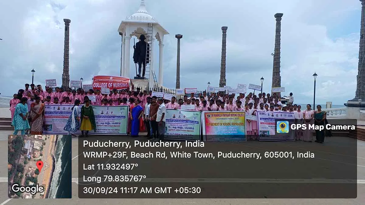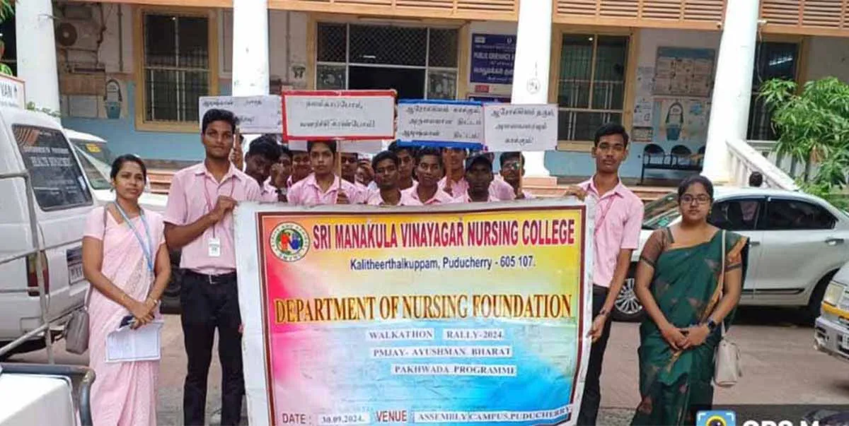 Participated in the Walkathon Rally on “PMJAY – Ayushman Bharat Pakhwada Programme” held on 30.09.2024 at the Assembly Campus. The event was inaugurated by Mr. N. Rangasamy and organized by the Ministry of Family and Welfare, Government of Puducherry. B.Sc. Nursing I Year (II Semester) students actively took part in the rally. Around 450 individuals benefited from the event.